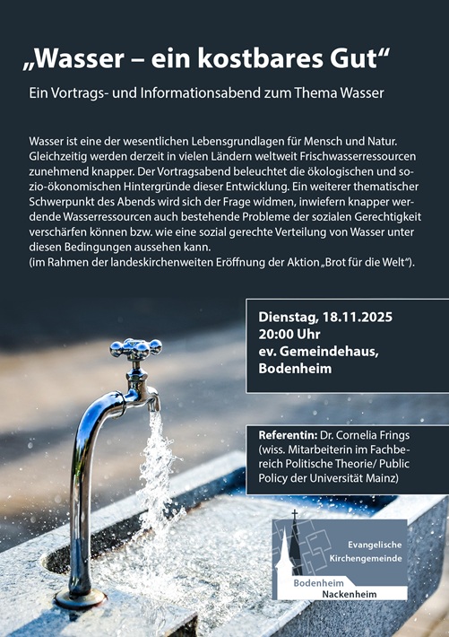 Wasser ist eine der wesentlichen Lebensgrundlagen für Mensch und Natur. Gleichzeitig werden derzeit in vielen Ländern weltweit Frischwasserressourcen zunehmend knapper. Der Vortragsabend beleuchtet die ökologischen und sozio-ökonomischen Hintergründe dieser Entwicklung. Ein weiterer thematischer Schwerpunkt des Abends wird sich der Frage widmen, inwiefern knapper werdende Wasserressourcen auch bestehende Probleme der sozialen Gerechtigkeit verschärfen können bzw. wie eine sozial gerechte Verteilung von Wasser unter diesen Bedingungen aussehen kann.