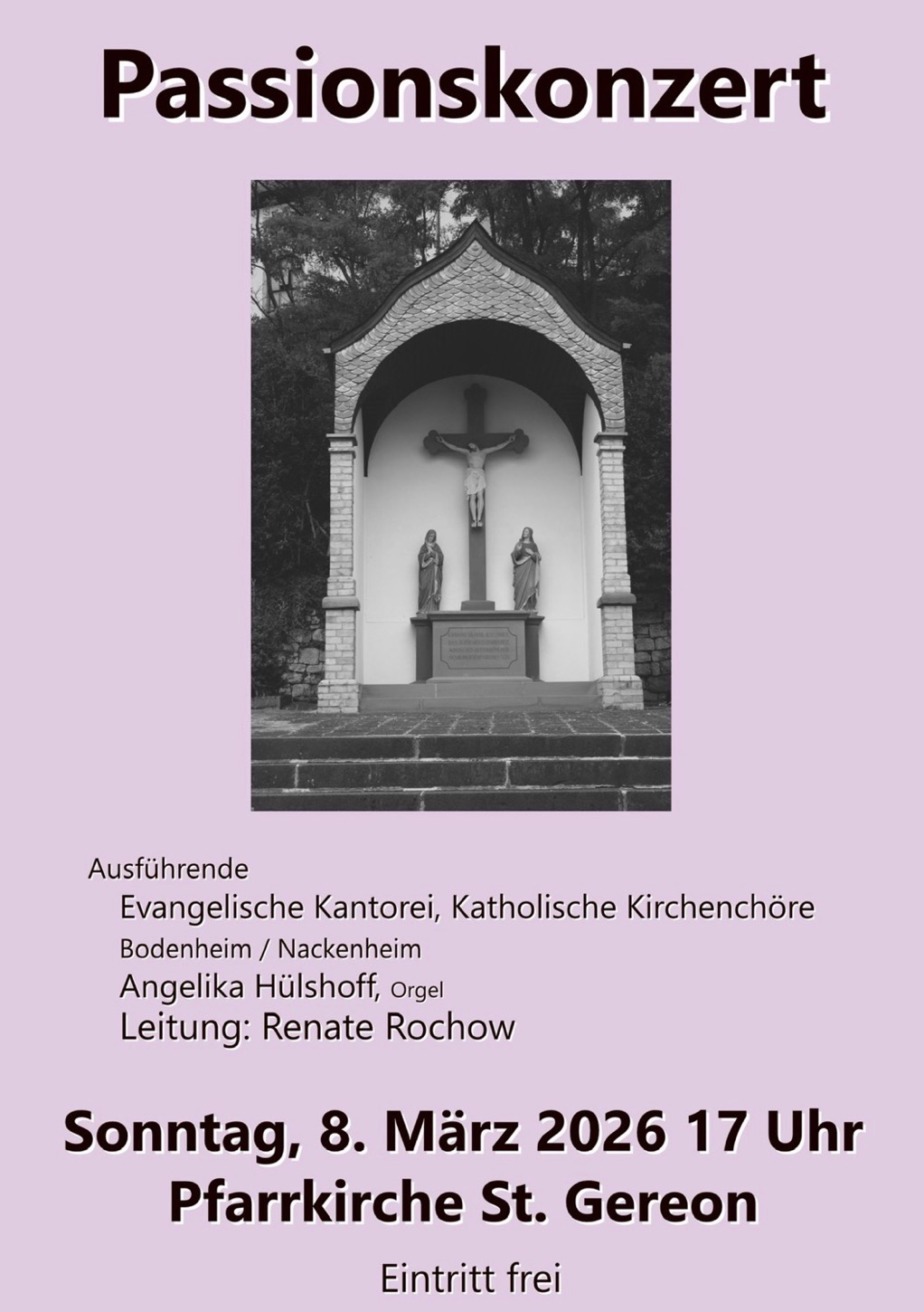Herzliche Einladung zum Passionskonzert am Sonntag, 8. März 2026 um 17:00 Uhr in der kath. Kirche St. Gereon in Nackenheim, Kirchbergweg 4. Sie hören Werke für Chor und Orgel, unter anderem das Stabat Mater op. 138 von Joseph Gabriel Rheinberger. Infos mit Klick auf Weiterlesen.