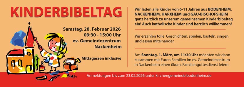Ökum. Familiengottesdienst zum Abschluss des KinderbibeltagesDatum und Uhrzeit: Sonntag, 1. März 2026 - 11:30 bis 12:30Ort: Ev. Gemeindezentrum NackenheimKontakt: Pfr'in Dagmar Diehl, Pfr. Thomas SchwöbelArtikelbild: Calendar / Kalender